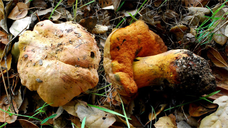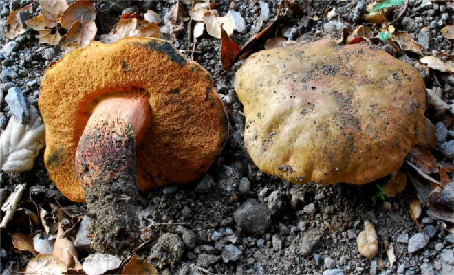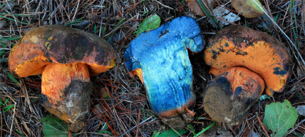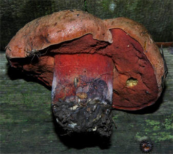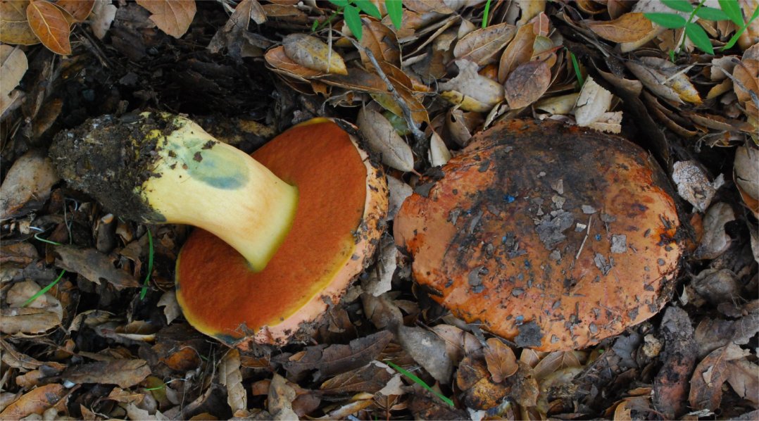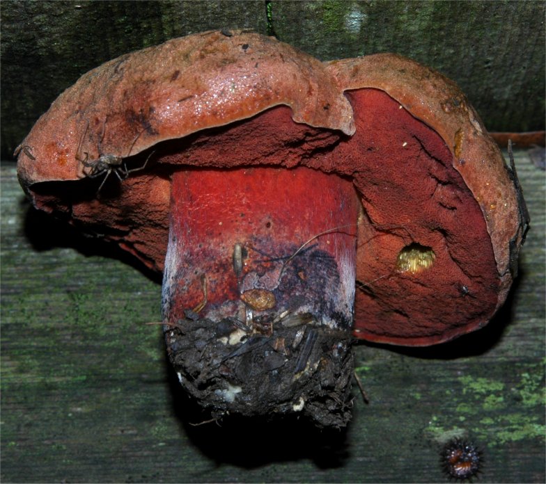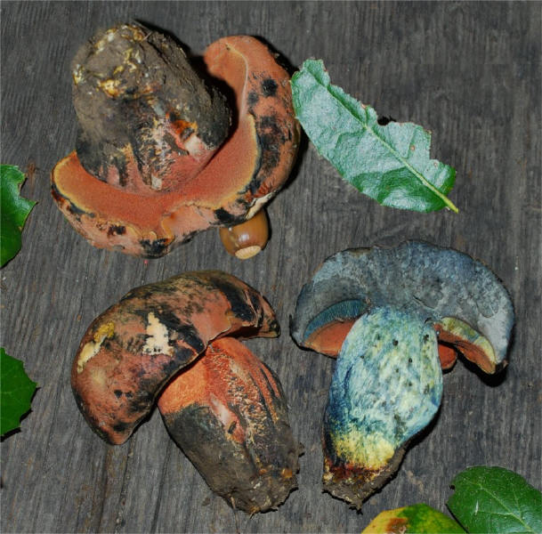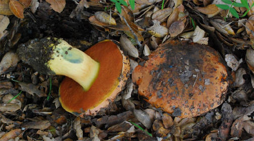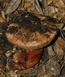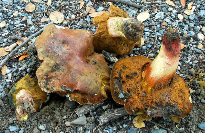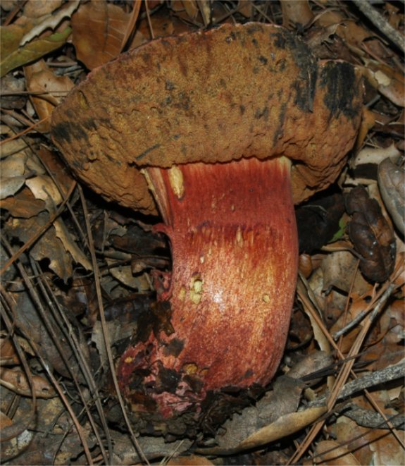 This red pored, bluing, non-reticulate Bolete is a native Californian with distribution along the Live Oak (Quercus agrifolia) belt. It is said to occur under Pacific Madrone and Manzanita, as well.