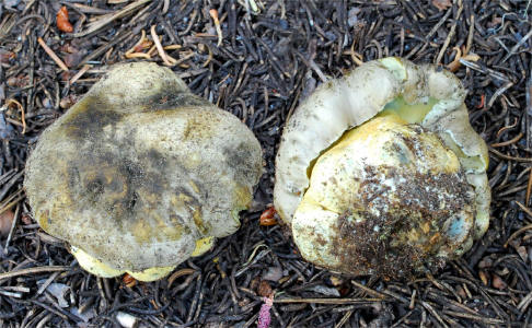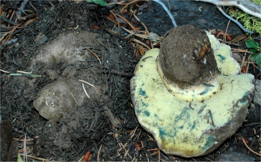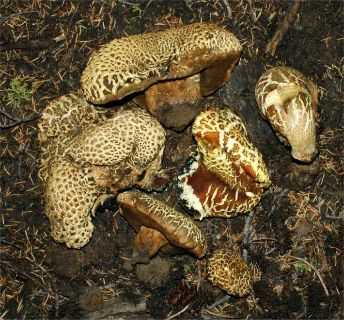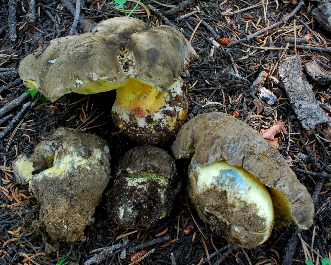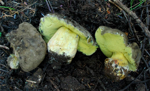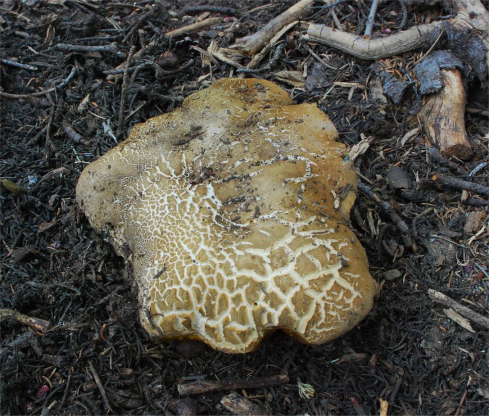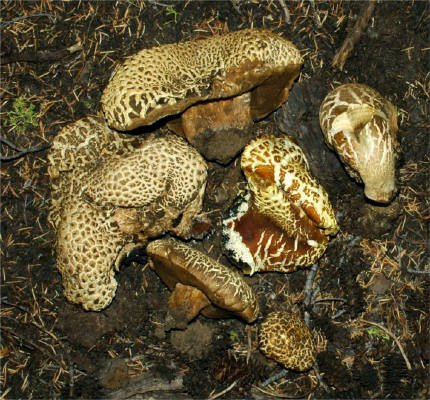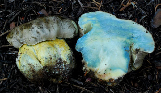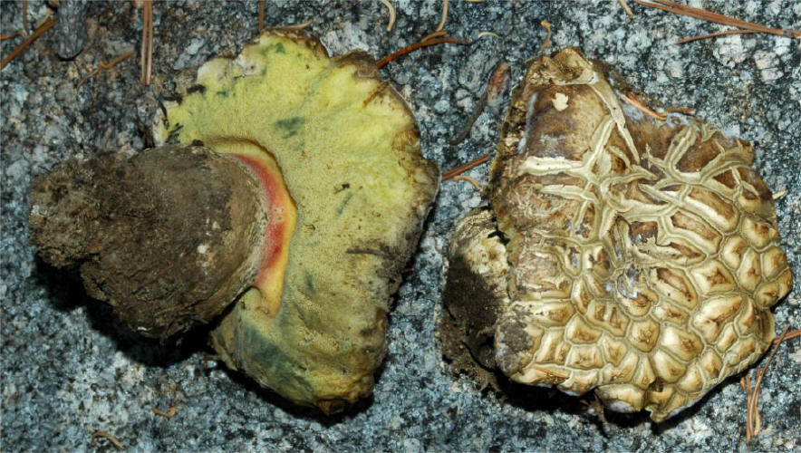 | This massive, bluing Bolete fruits in the higher elevations of Sierra Nevada, early in the season -- Aug/Oct. In the typically dry Sierra weather, the pileus tends to become exceedingly aerolate and hard, bearing superficial resemblance to Neolentinus ponderosus. It's bitter taste is unmistakable. It seems quite close to Boletus coniferarum, and is probably only a distant relative of the European B. calopus var. calopus. |