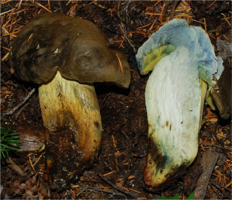 | This species is quite similar to B. calopus var frustosus, but lacks any red color on the upper stipe. At the same time it fullu qualifies for the epitet "Bitter Butter Bolete" Equally buttery and bitter. Distribution: Alaska to Oregon, under conifers. I have never seen it in California. Based on my observations in Oregon, I suspect that it is associated with Tsuga sp. |