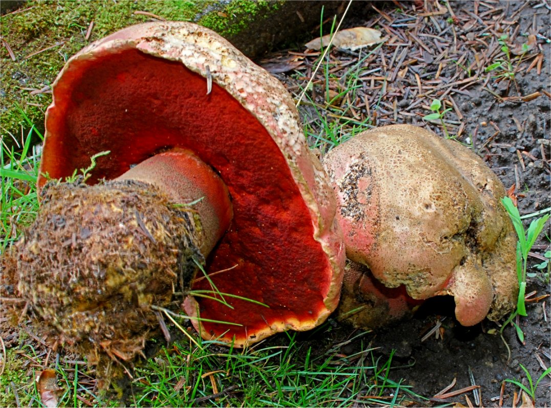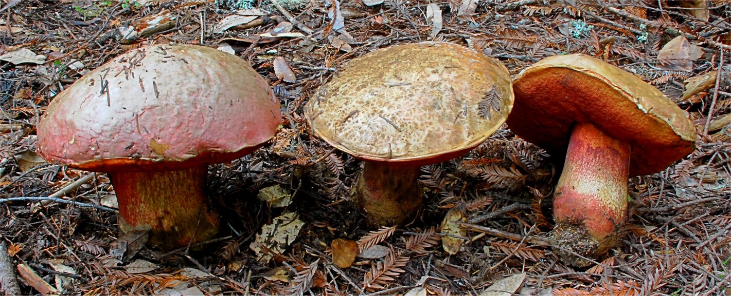 | The group of reticulated, red sponged, and bluing Boletes form Section Luridi. These are some of the most gorgeous representative of the genus, featuring vivid red sponge and a reticulated stipe. The members of this group pass loosely as Satan's Boletes, although that there are about a dozen species in there. This California taxon was involved in a little taxonomic mess involving the name B. eastwoodiae, but a 1976 paper by Thiers&Halling erected the current name and straightened things out. This species by definition is confined to the Coastal areas. A somewhat similar Bolete, called B. haematinus fruits high in the Sierra Nevada. |